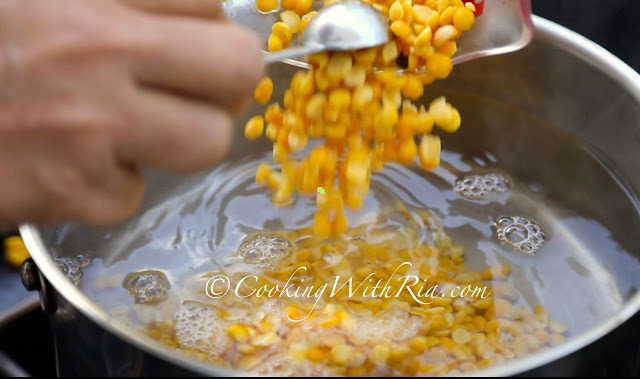 - Using a pot cover to prevent oil from splashing, slowly add heated oil with the cumin and garlic to the split peas. This process is called "chunkaying" (pronounced Chung-k-ing). Mix well, test for salt and add more if required.