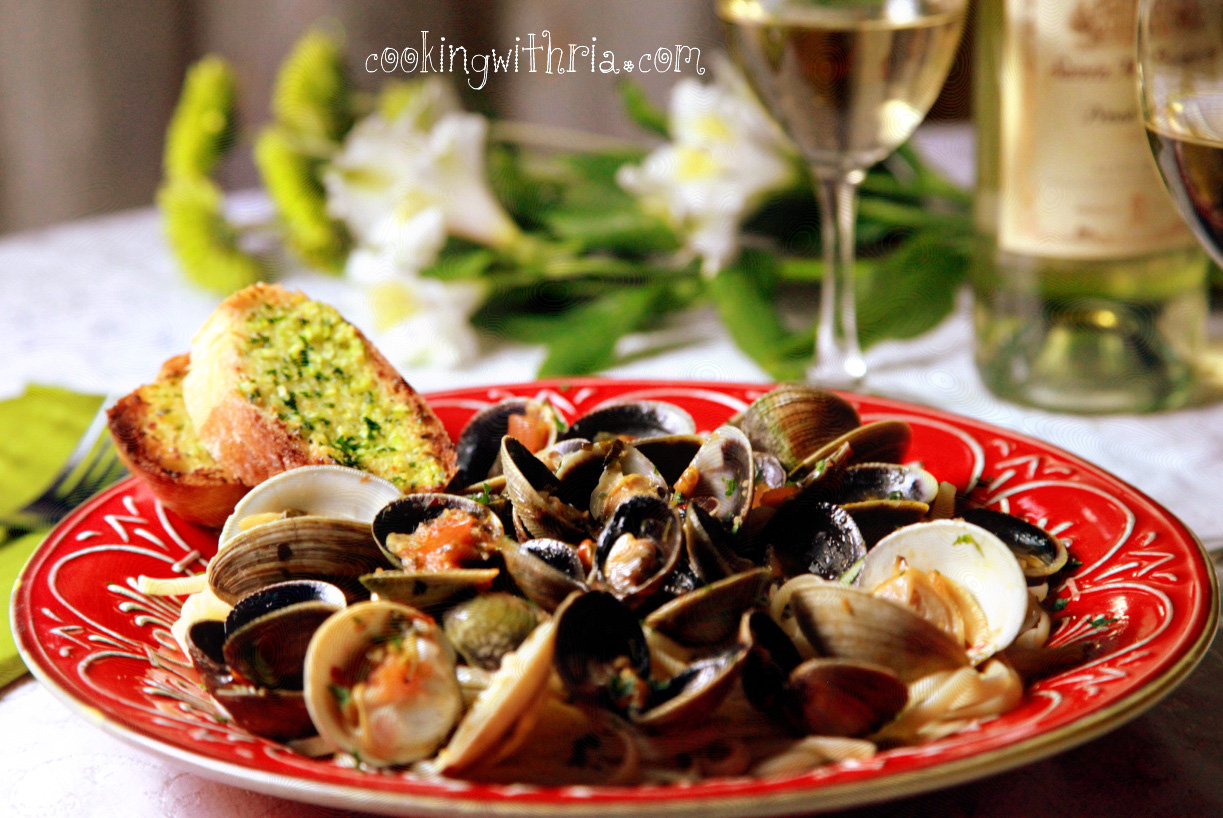 A day before my birthday, I drafted up this recipe for clams with linguine, using several recipes I had collected and forwarded it to him via email….[and made a mental note to eat a small dinner before going home on my big day…just incase]. I chose this recipe because it requires only few ingredients, preparation is effortless and clams cook in 5-8 minutes!
