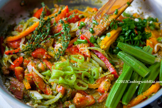 - 4: Add ingredients: Add tomatoes, sweet peppers, green seasoning, cook 2-3 minutes, stirring continuously.