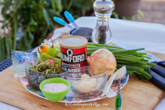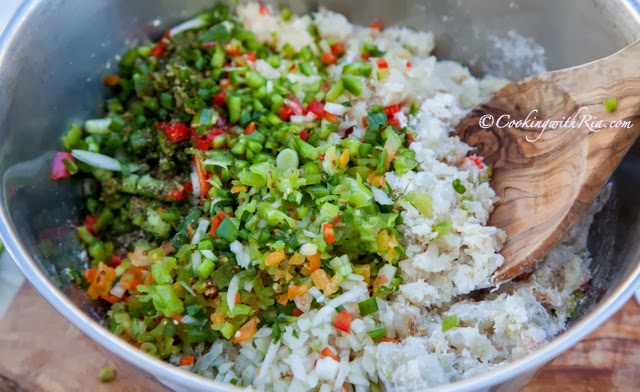 It may seem like a lot of ingredients for what should be a simple fritter, but Mummy always preached “needs more seasoning” when I was learning to cook, so “robust flavor” is my main priority when creating a recipe or dish. The ingredients, however, are all familiar and are probably already waiting for you in your refrigerator or pantry. I added the blended green seasoning to create a flavorful backdrop for the other ingredients. The other ingredients are not only healthful, but they also add texture, flavor and create a perfect savory balance which leaves you wanting more!!!