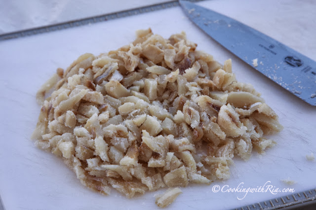 Using a knife, cut salt fish into small pieces. Soak for several hours. Rinse with several changes of water until only a hint of salt remains. Squeeze out all liquid from the saltfish. (Alternatively, you may rinse salt fish, then boil, changing water several times, drain, transfer to a bowl and flake) .