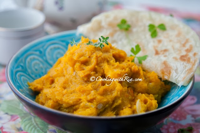In my recipe below, cubes of pumpkin are sautéed with the simplest of ingredients: olive oil, garlic, onion, and the optional hot pepper. It’s steamed until tender, then mashed to a smooth, paste-like consistency. Roasted ground geera (cumin) is also added at the end of cooking to highlight the flavor of the pumpkin. (Mummy swears by the addition of a little brown sugar).