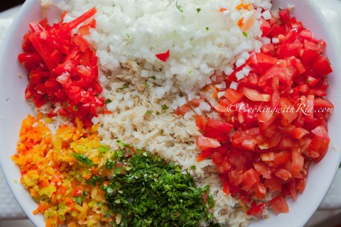 4. Place the flaked fish in a bowl. Add the remaining ingredients – onion, garlic, chopped bell and pimento peppers, chopped culantro (and optional ingredients if using).