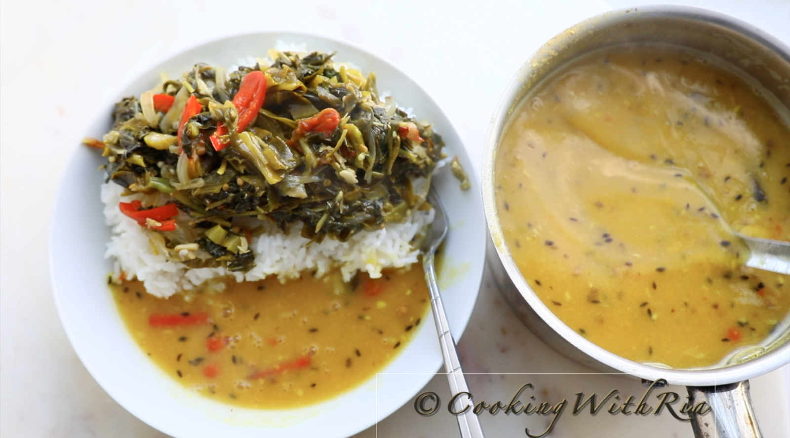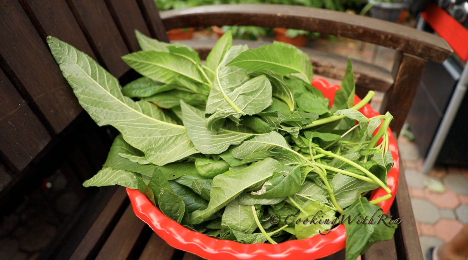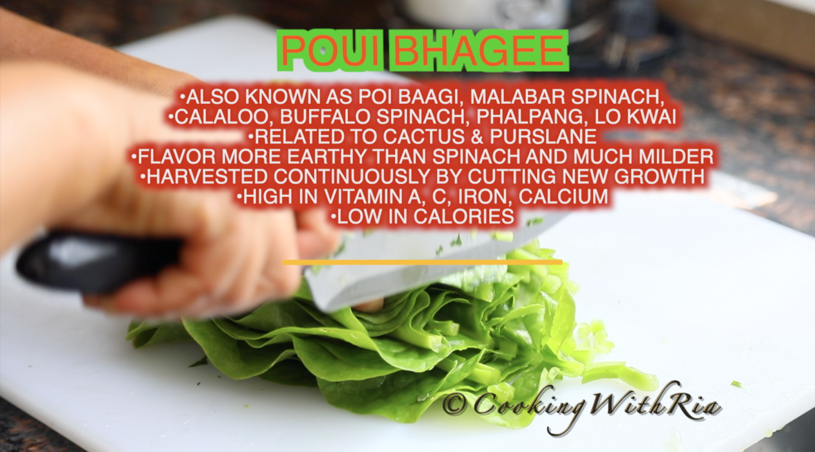 - 1/2 lb Poui bhagee Malabar spinach, chopped (About 20 large leaves)