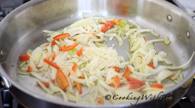 - Add onion and hot pepper (if using), bell pepper and cook for two minutes, stirring.