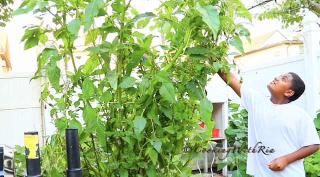 I decided to use both the Jamaican Callaloo bush and poui bhaghee in this dish because of the availability. I also added two okras and a small bell pepper I picked from my garden. The combination was nothing less than sensational.