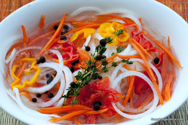 - Remove from heat and let it cool. Pour the cooled mixture over the sliced onion, carrot, sweet pepper, and hot pepper.